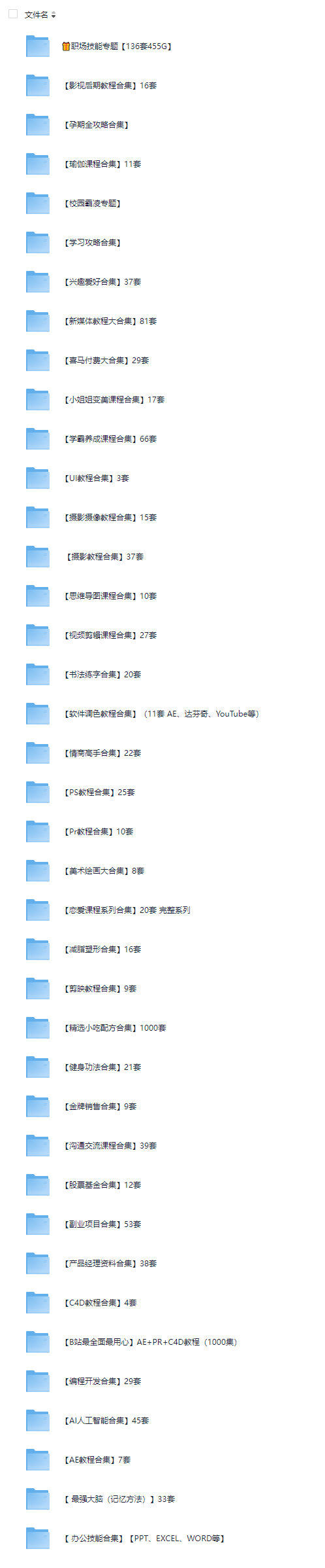 课程内容覆盖各种办公软件学习、考试考证、自媒体运营、短视频剪辑、副业项目、恋爱秘籍、兴趣爱好、理财金融、人工智能、职场进阶、人际关系、网络营销等,所有课程一站式配齐,持续更新,一次加入,终身免费。